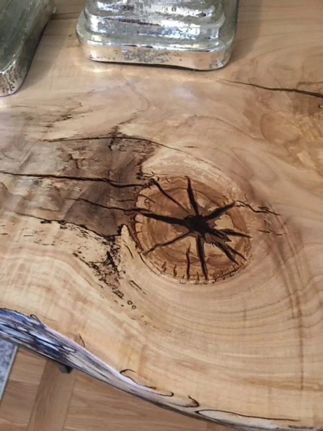 This unique hall table with a lower shelf was created with a maple hardwood slab with beautiful spalting and figuring. Some cracks were filled with resin and a larger crevice was left natural for a custom, one of a kind look. Finally, it was fitted with custom metal legs.